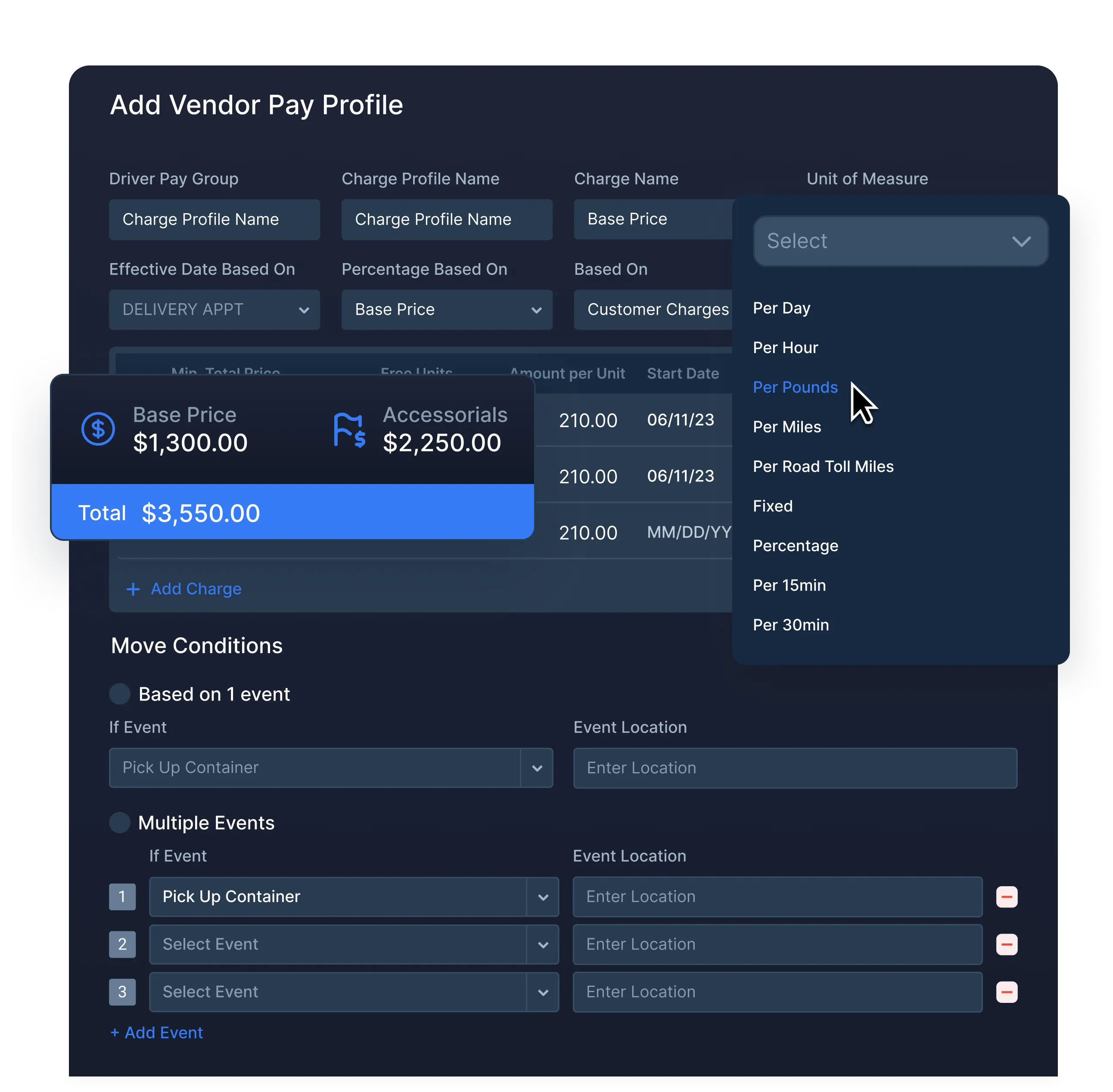 Never manually calculate carrier invoices again. Set carrier pay rates and setup recurring accessorial charges in the system, and PortPro automatically makes the calcuations for you.