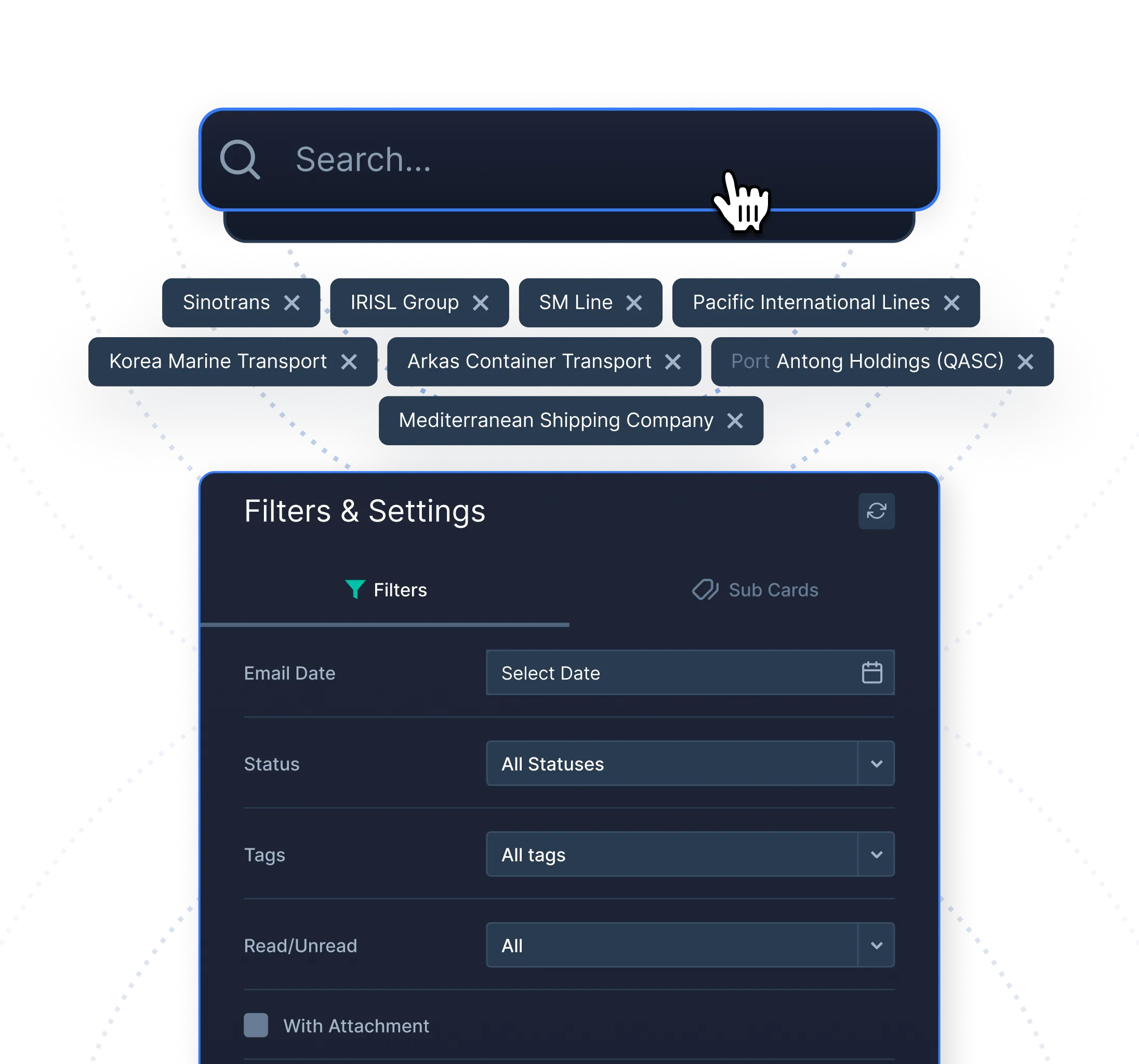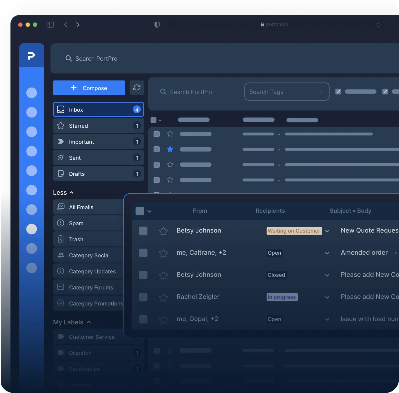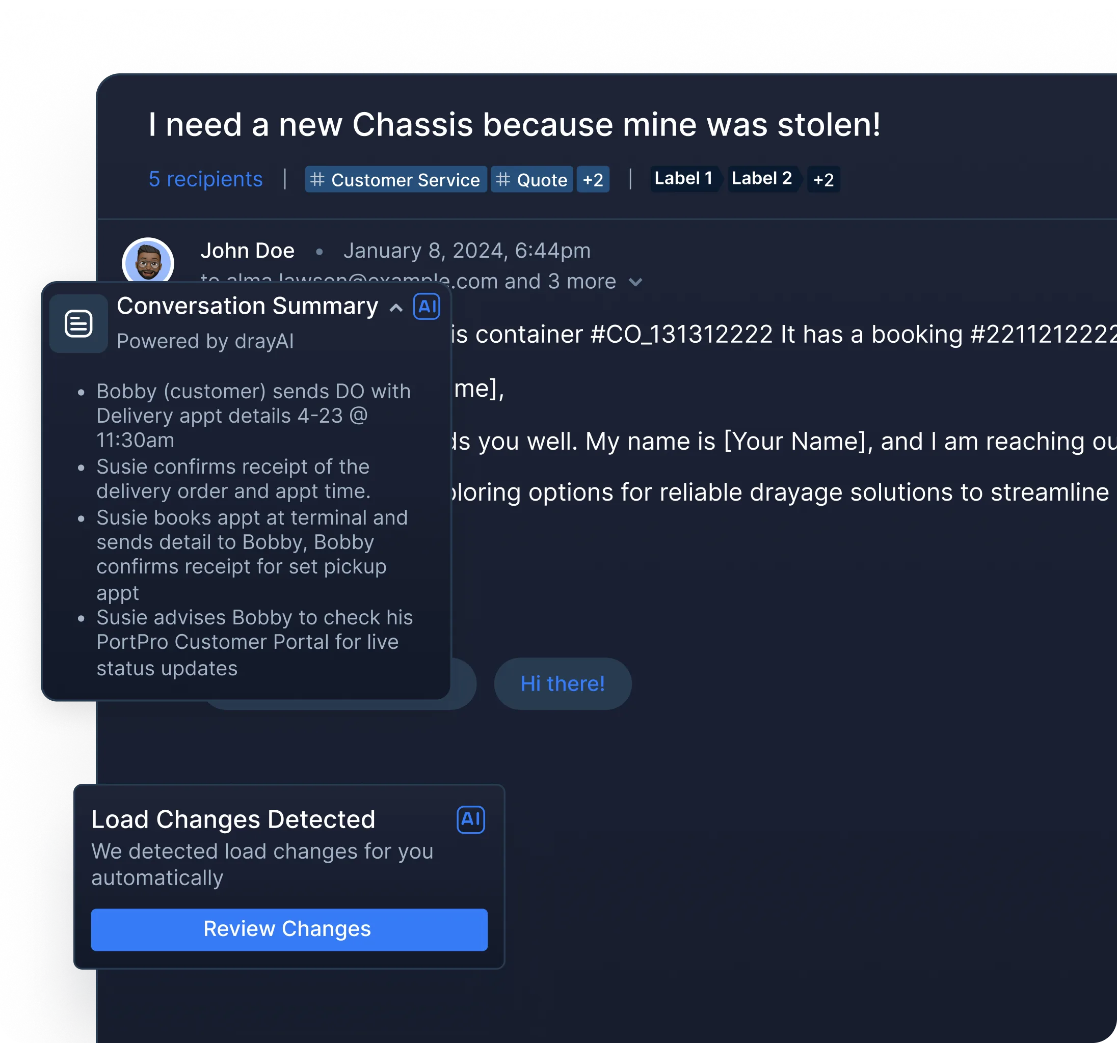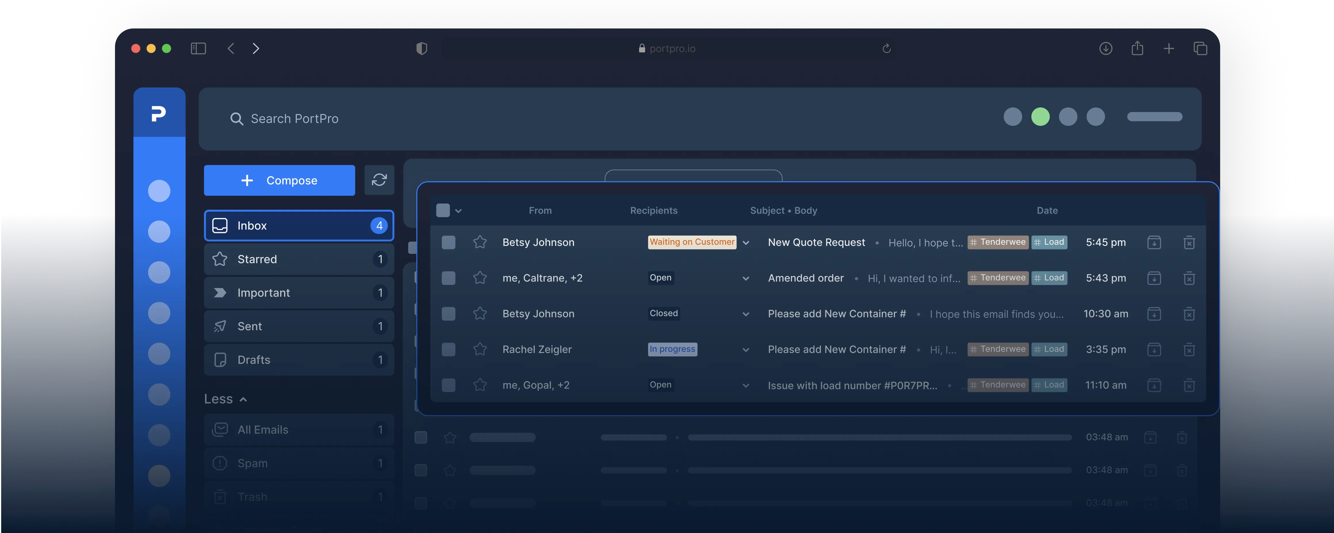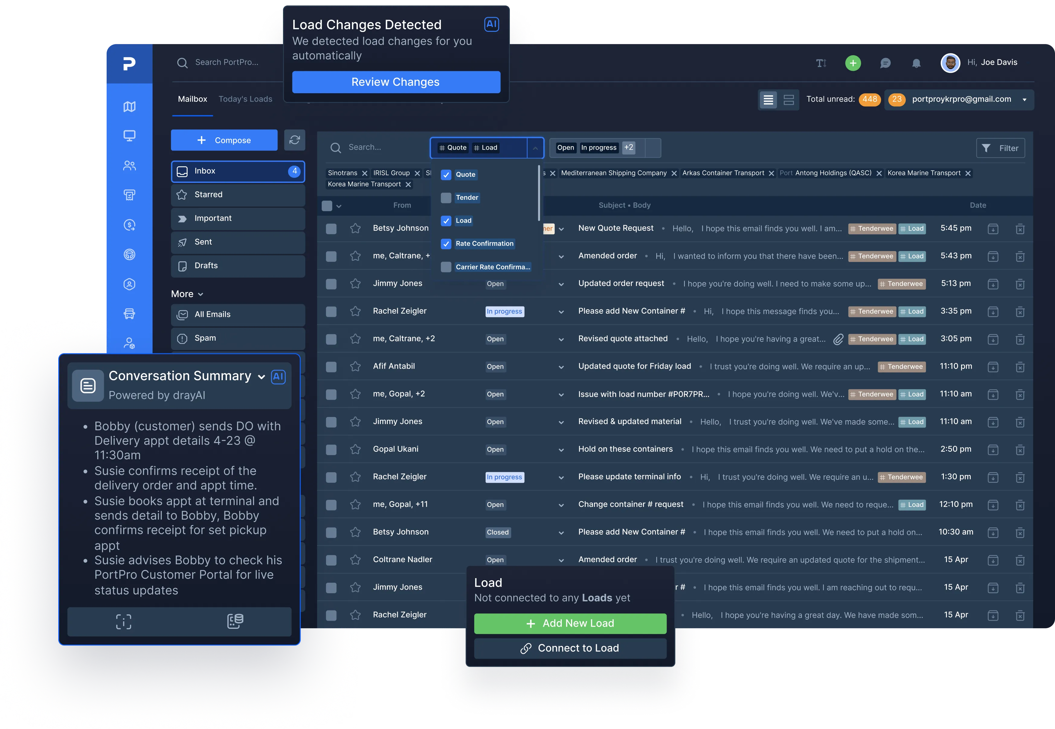 PortPro’s integrated email goes the extra mile by harnessing the use of artificial intelligence. Our AI will learn, improve, and adapt to your workflows over time with usage - getting better with reading email signals and suggesting actions for your team to take.
